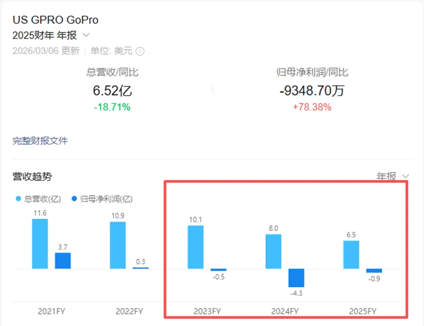2025财年,GoPro全年营收6.52亿美元,同比下滑19%;净亏损约9300万美元。算上2023、2024年的亏损,三年累计亏损接近5.7亿美元,折合人民币将近40亿元。出货量方面,全年约180万台,同比继续下降约25%。年初管理层信誓旦旦说要年底前恢复盈利,结果第四季度还是亏了910万美元。