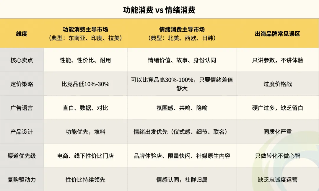 在价格敏感度高、收入水平较低、基础设施尚未成熟的市场,功能权重更高;在中高收入、文化成熟、品牌密集的市场,情绪权重显著上升。