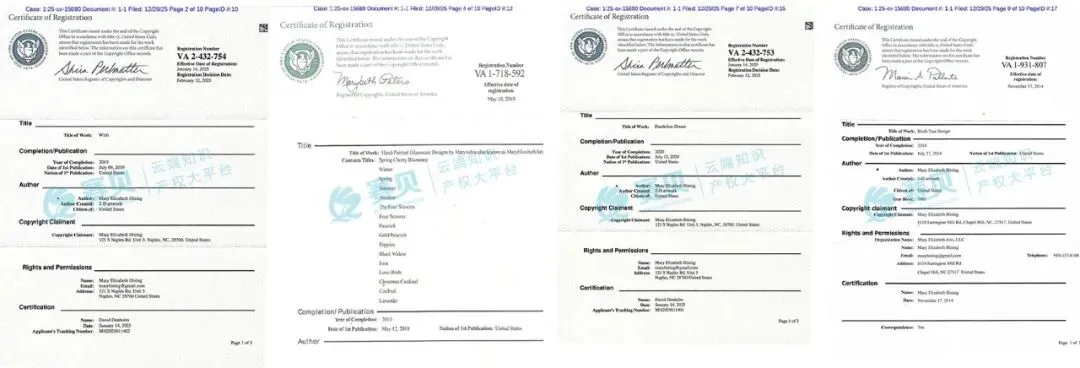原告此次维权的是4项艺术作品,版权号为 VA 2-432-754、VA 1-718-592、VA 2-432-753、VA 1-931-807,这些作品的元素集中在自然主题,包括花卉、鸟类、树木、四季风光等。需要提醒的是,未经授权擅自使用,都可能构成侵权。