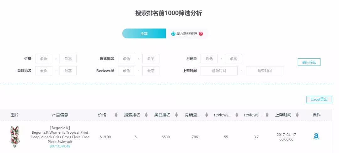 如果你对泳装市场还很迷茫,不妨看看分析中的【潜力新品推荐】,船长大数据通过对美国站“Clothing, Shoes & Jewelry”类目下的关键词“swimsuit”综合分析后推荐出20款具有爆款潜质的新品,供大家作为选品或开发的参考。