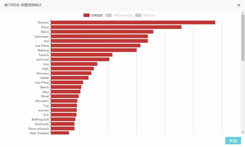 在亚马逊的(Women)泳装类目下分有Bikinis、Tankinis、One-Pieces、Cover-Ups、Board Shorts、Racing、Rash Guards等小类,不过我们通过搜索排名前1000的详细数据以及标题词频统计可见,热销&热搜最多应为Bikinis和One-Pieces。