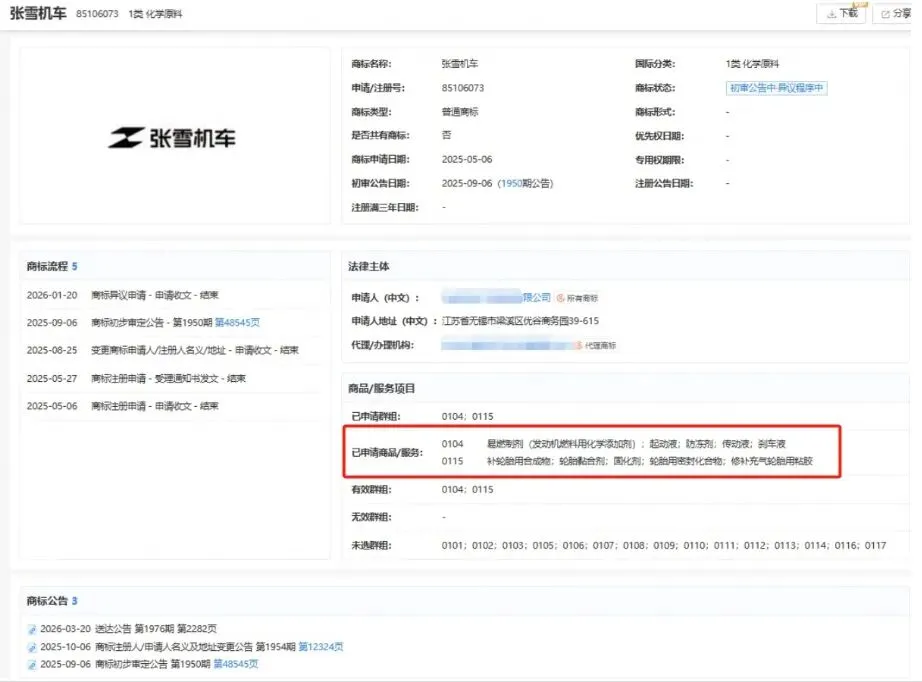 然而,就在全网为国产机车欢呼之际,一则令人气愤的消息浮出水面——“张雪机车”商标早已被恶意抢注。经查,无锡市给力润滑油有限公司早在2025年5月6日,便申请注册了“张雪机车”商标,类别为第1类“化学原料”,目前处于“等待实质审查”状态。更值得警惕的是,该公司同年还抢注了与张雪深度绑定的“凯越机车”商标(同属化学原料类),且已注册成功,两项商标均由同一家知识产权代理公司代办。此外,该公司还曾注册过“碧福剑”“飞猪FLIGGY”等多个知名品牌相关商标,明显具有恶意囤积、蹭热度牟利的意图。