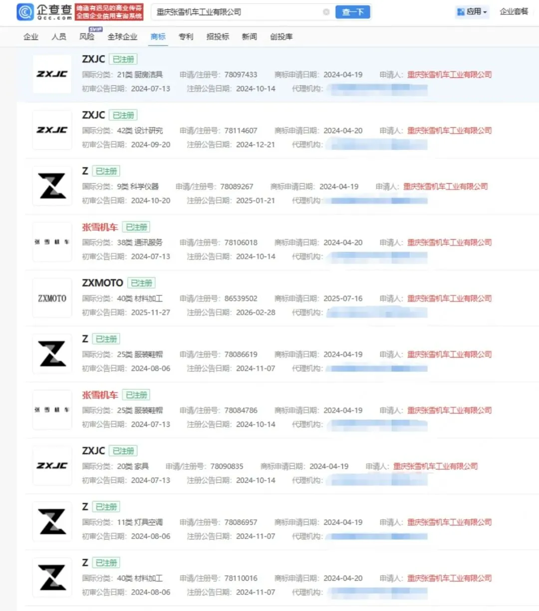 张雪机车自2024年4月成立以来,就高度重视商标保护,走出了一条“核心类别优先、关联类别延伸”的布局路径。成立仅半个月,公司便在第12类“运输工具”(机车核心类别)提交了“张雪机车”商标申请,并于同年10月成功核准注册,牢牢锁定了品牌核心标识,从源头防范了核心业务被抢注的风险。截至2025年11月,张雪机车在国内申请的商标已达112件,不仅覆盖机车相关的核心类别,还延伸至第16类(办公用品)、第40类(材料加工)等上下游产业品类,形成了全面的商标防御体系。
