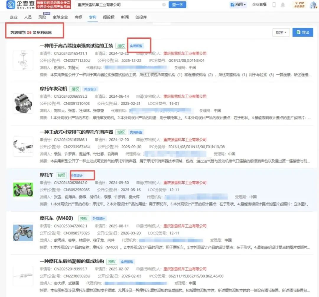 截至目前,张雪机车已拥有近20项技术专利,涵盖发明专利、实用新型专利及外观设计专利三大类型,另有7项专利处于实质审查阶段。其中,发明专利聚焦摩托车充电系统、可变排气阀门控制等核心技术,成功突破了外资品牌在振动控制、高转速稳定性等方面的技术壁垒;实用新型专利涉及制动、配件等多个领域,提升了整车性能与实用性;外观设计专利则覆盖820RR、M400等主力车型,保护了品牌独特的设计语言,避免了跨境销售中常见的“山寨仿冒”问题。这种“技术+专利”的组合,不仅让张雪机车在国际赛道上站稳脚跟,也为其跨境出海规避了技术侵权风险,提升了品牌在海外市场的核心竞争力。