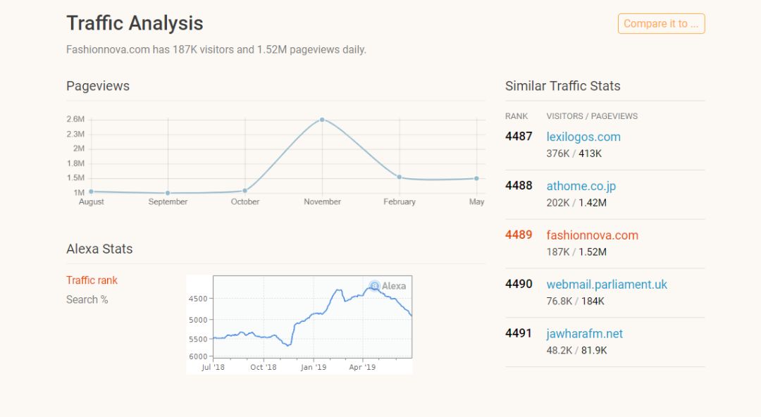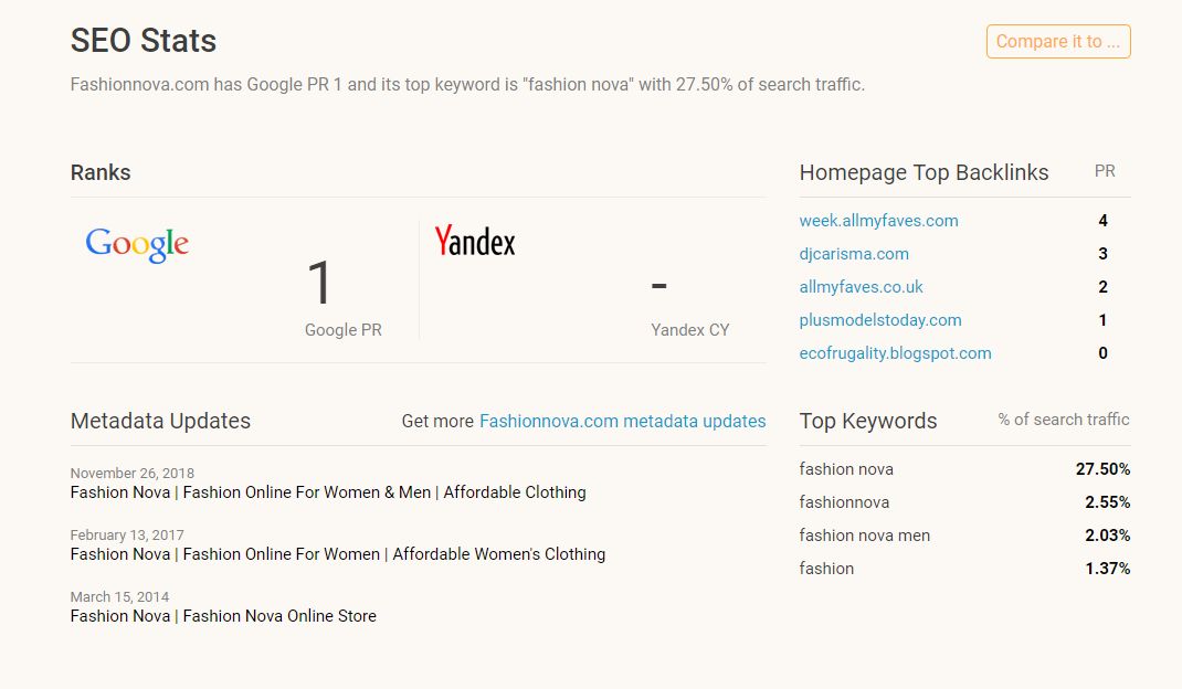 Fashionnova.com拥有Google PR 1,其顶级关键词是“fashion nova”,拥有27.50%的搜索流量。