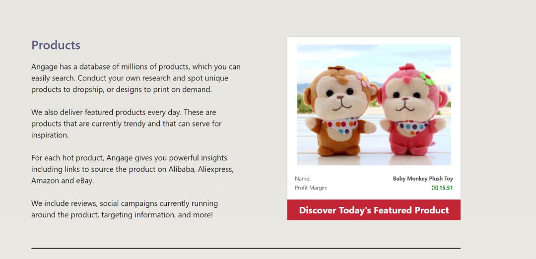 Angage拥有数百万种产品的数据库,可以轻松搜索。进行自己的研究,发现独特的产品到dropshipping。