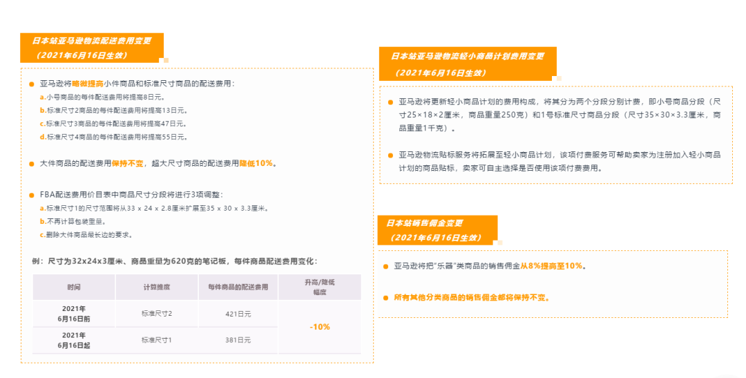 【2021年亚马逊日本站FBA费用和销售佣金变更】3月18日消息,亚马逊方面表示,考虑到新冠肺炎疫情可能会给小企业带来的不确定性,亚马逊在2020年12月决定将年度费用调整时间延后至2021年春季。对此,亚马逊日本站也将重新发布年度费用调整通知,费用调整生效时间为2021年6月16日。具体公告内容如下: