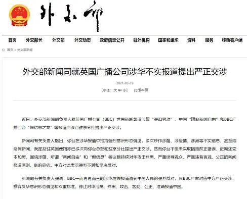 【外交部新闻司就英国广播公司涉华不实报道提出严正交涉】近日,外交部新闻司负责人就英国广播公司(BBC)世界新闻频道涉疆“强迫劳动”、中国“限制新闻自由”和BBC广播四台“假信息之龙”等报道向该台驻京分社提出严正交涉。新闻司有关负责人指出,你台在涉华报道中抱持强烈意识形态偏见,多次炒作涉疆、涉疫情、涉港等不实信息,甚至炮制假新闻,我部及驻英国使馆亦已多次向你台总部和驻京分社提出严正交涉。然而你台不但未采取措施改正错误,近期还变本加厉,围绕涉疆、所谓“新闻自由”和“假信息”等议题持续对华攻击抹黑,严重误导观众,严重违背客观、公正的新闻报道原则,影响恶劣。中方对此表示强烈不满和坚决反对。新闻司有关负责人强调,BBC一而再再而三的涉华虚假报道遭到中国人民的强烈反对,希BBC严肃对待中方严正交涉,摒弃反华意识形态偏见和双重标准,停止对华污蔑、抹黑、攻击,客观、公正、准确报道中国。