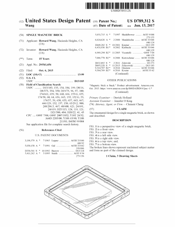 本案涉及外观专利维权,涉案专利编号“US D789312 S”于2017年6月13日下证,保护期15年,保护范围涵盖积木整体轮廓、边角处理及表面装饰性凹槽/凸起等: