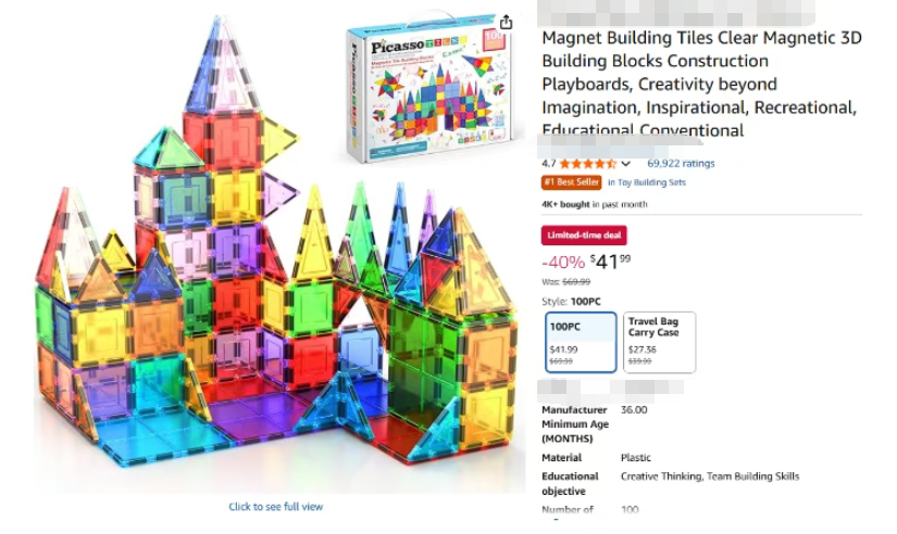 PicassoTiles 100 Piece Set 在亚马逊的 Toy Building Sets 类目中位列畅销榜第一名,上个月销售量已超过 4000 件,累计评论量已近 7 万条。