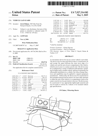 原告Jonathan Kotyk是一位来自美国佛罗里达州的独立发明人,针对机动车辆座椅间存在的间隙引发不方便的诸多问题,设计了一款车座间隙防护装置,一种可拆卸、轻质阻燃材料制成的楔形挡板。