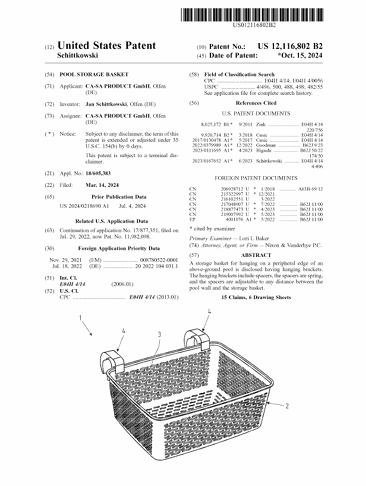 本案涉及发明专利维权,涉案专利编号为US12116802B2,于2024年10月15日正式下证:发明专利保护的是“结构+功能”,只要泳池挂篮具备“弹簧式间隔件+可调节悬挂支架”核心特征,即使外观、颜色、尺寸不同,也可能落入 该专利的权利要求范围。