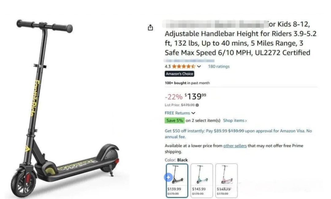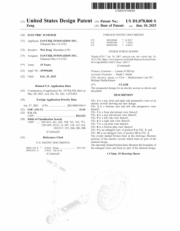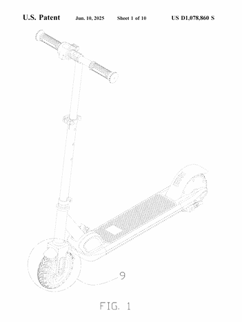 本案涉及外观专利维权,涉案专利编号为“USD1078860S”。发明专利保护“功能”,而外观专利只看“视觉效果”——只要儿童电动滑板车整体外观与专利图使普通消费者产生“混淆性相似”,即可能落入保护范围。