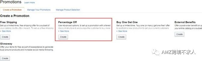 路径:以美国站点为例,先进入卖家后台,在" Advertising "下拉菜单中选择 Promotion,进入下图。进入以上页面后,再点击 Create,进入 Percentage Off促销规则设置页面。
