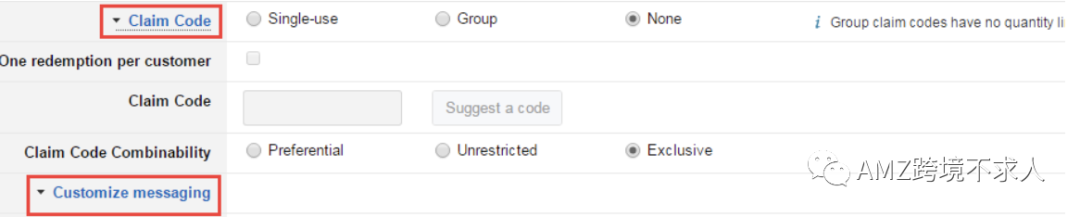 Claim Code Combinability:优惠码类型。有三个选项,分别是preferential(优先使用)、Unrestricted(无限制)及 Exclusive(排他性)。建议新手卖家还是选择系统默认的 Exclusive,意思就是卖家使用了这个优惠码后就不能享受其他的促销活动。