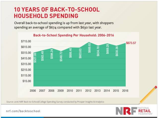 研究表明,从幼儿园到12年级的学生家长,平均花费674美元给孩子购买新款运动鞋、潮流服饰、电子产品、计算器和书夹——大学生家长甚至会花费更高。