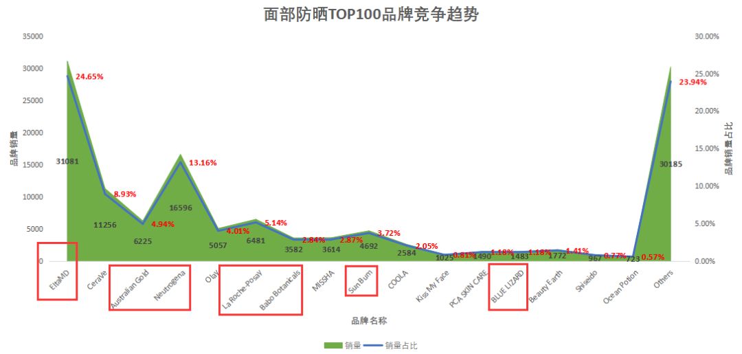 两个小类目BSR TOP100中,均有其他类型产品出现,如面部防晒中含有身体防晒、儿童防晒和唇部防晒这种情况,在调研过程中面部和身体防晒不易区分,因此以上数据只能作为参考,大致判断品牌竞争性。
