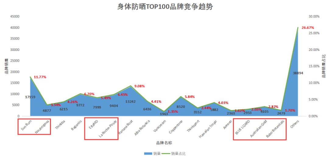 面部防晒一共有43个品牌,EltaMD、Neutrogena、La Roche-Posay、Sun Bum品牌销量占比较高,品牌竞争性较强;身体防晒产品中一共35个品牌,同样,也是Sun Bum、Neutrogena、EltaMD、La Roche-Posay几个品牌销量占比较高。原因之一是两个类目单品有交叉出现情况,且均是销量比较好的几款单品;其二是这些品牌在业内口碑较好,有一定影响力,从而促使订单产生,销量增加。