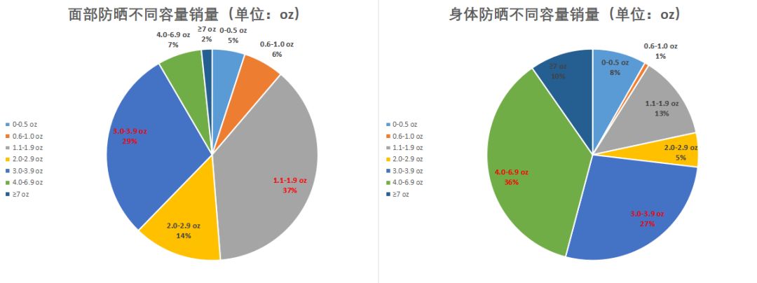 (2)容量部分:面部防晒低于3oz,身体防晒3-5oz;
