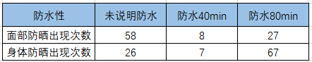 亚马逊美国站防晒霜产品在防水性方面一共有不防水、防水40分钟、防水80分钟三种,由上图可以看出,与面部防晒相比,身体防晒的产品中对防水性要求更高,约74个单品有防水防汗功能,放水时间80分钟(超级防水)的有67个单品,买家对防水功能还是有较大需求。