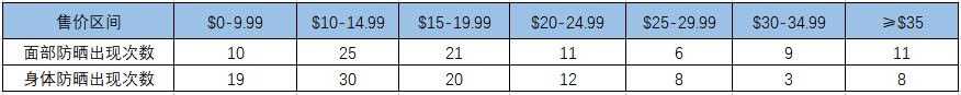 防晒霜类产品主要定价区间在35美元以下,面部防晒产品无销量特别好的定价区间,各个定价区间似乎都能被买家接受;而身体防晒产品主要定价及销量均低于20美元区间,69个单品,销量占比71%,相较于面部防晒,身体防晒产品定价稍低,但不绝对。