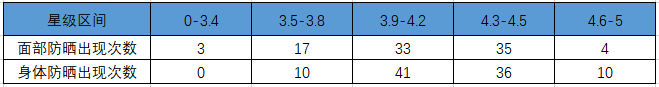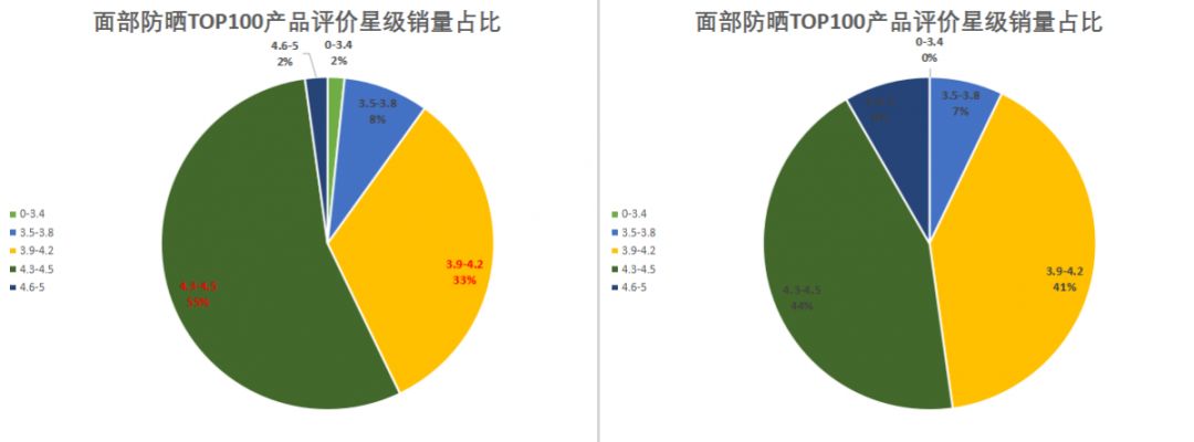 两类防晒产品,评价星级都不低,如上图所示,3.9-4.5星成为市场集中评价区间,无论是单品数还是销量,均占比极高。品牌优势在体现的比较明显,有一定知名度的品牌位于该市场,产品质量有保障,是一切好评的根源所在。