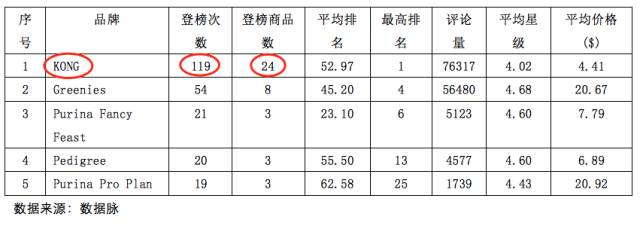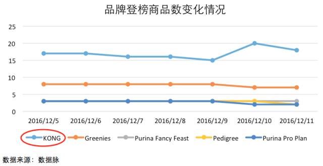 宠物玩具品牌 KONG 全面领先于榜单上的其他各类品牌,以七日内单日登榜商品数稳定保持在15款以上的惊人成绩荣膺综合排名首位。除此之外,宠物零食品牌 Greenies 同样保持稳定发挥,一周内单日登榜商品数维持在7款以上,位居综合排名第二。