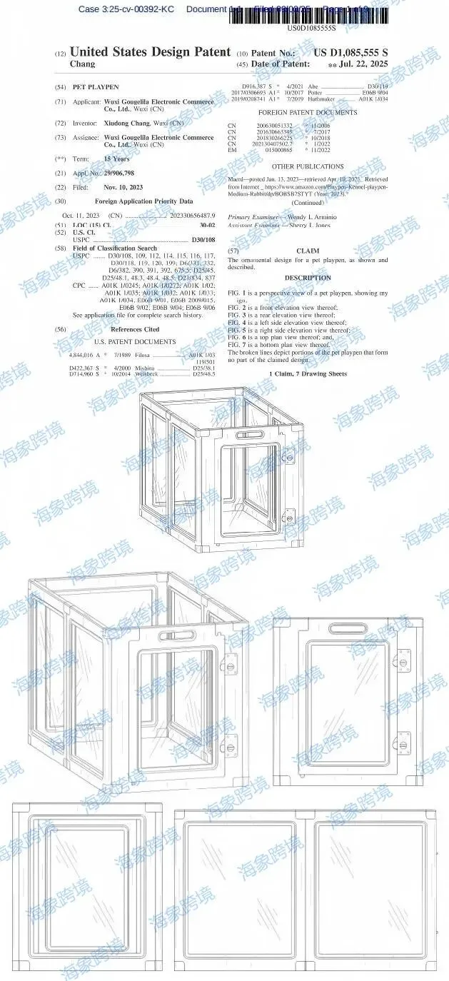 本案为国人原告,案件涉及专利产品是一款宠物围栏。专利细节如下,宠物用品卖家速查下架!