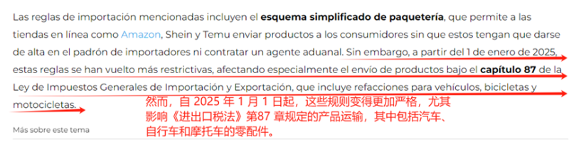 具体来说,此前墨西哥海关部门规定,包括亚马逊在内的跨境电商平台可以通过简化快递制度向消费者直接发货,无需消费者注册为进口商或委托报关代理。然而,新规上线后,墨西哥原有的简易包裹清关条件被取消,尤其针对属于《一般进出口税法》第87章的商品的监管力度大幅加强,涉及商品包括汽车、摩托车、自行车及其配件等,相关跨境卖家物流清关因此受到影响。