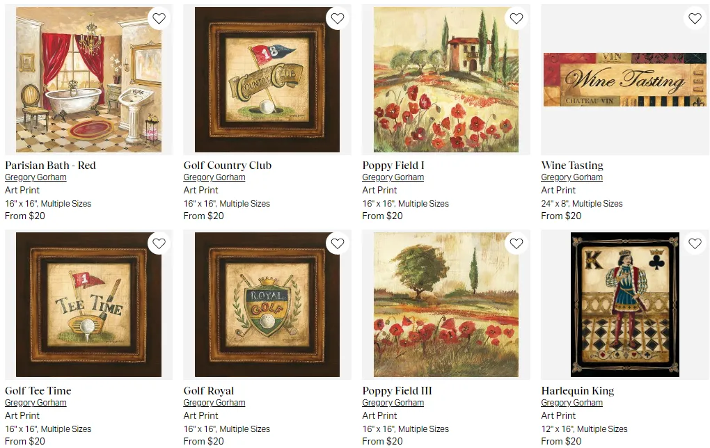 Gregory Gorham 代表性系列包括复古厨房、圣诞节庆与农舍风格主题画作,画风细腻又充满亲切感。其作品由多家艺术品平台授权发行,用于艺术复制、装饰画及文创产品等商业用途。