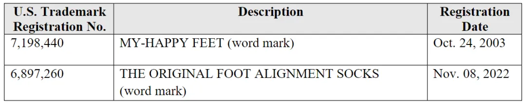 本案为商标侵权,涉及原告旗下2个商标词:MY-HAPPY FEET、THE ORIGINAL FOOT ALIGNMENT SOCKS;注意: 未经授权擅自使用其商标词,存在严重侵权风险!