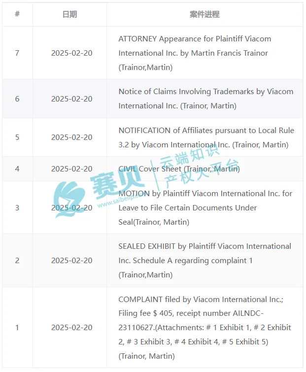 Tme律所代理Viacom International Inc公司,在伊利诺斯州北区法院提起了诉讼案件25-cv-1785,涉及商标和版权侵权。