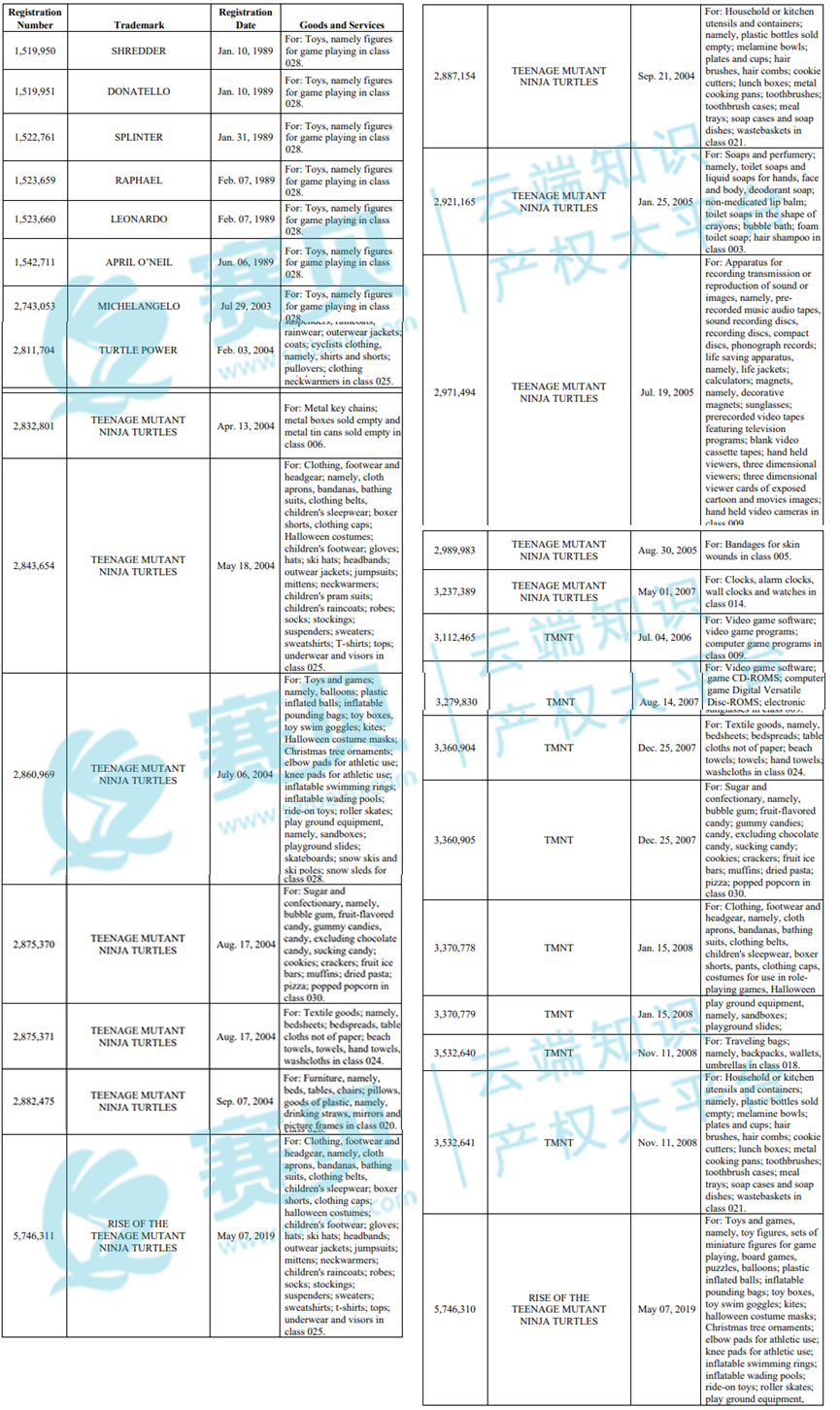 本案涉及以下商标,其中TEENAGE MUTANT NINJA TURTILES的文字和图形商标,以及TMNT尤其需要注意,原告在较多商标类别上注册了这几个商标,卖家请勿在未经授权的情况下使用这些商标。