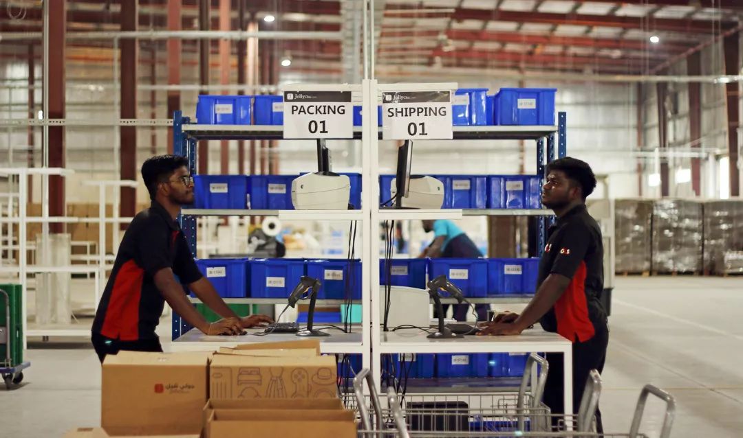 Jollychic员工在位于迪拜的仓库操作台工作