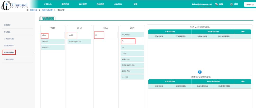 点击货运信息转换,然后分别选择市场、账号、站点及仓库。