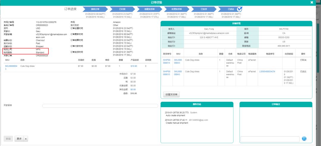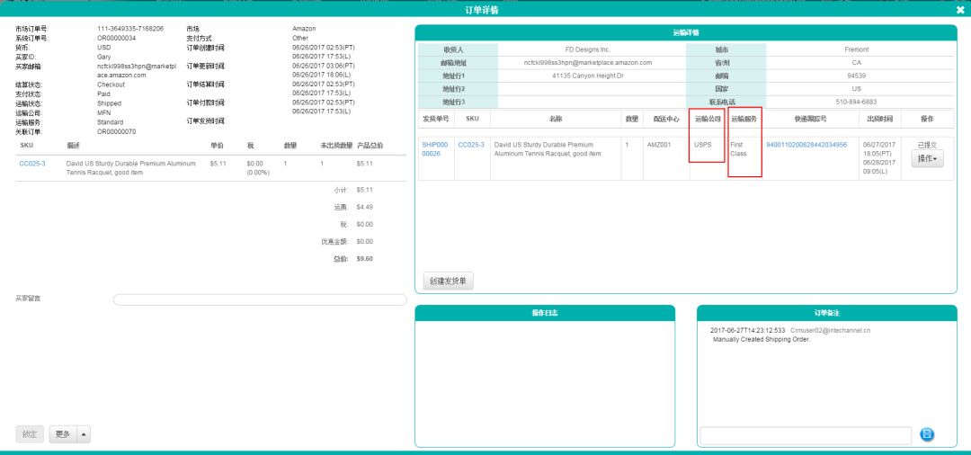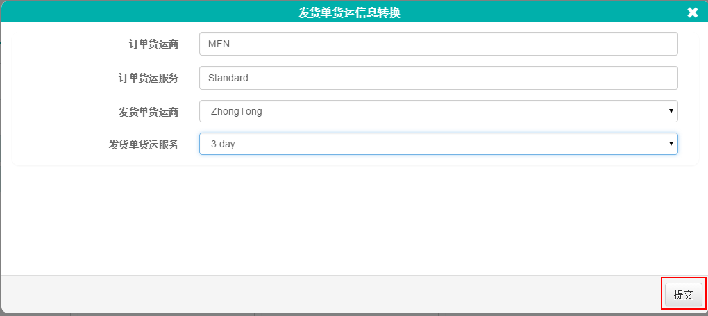 填写订单货运商名称、订单货运服务;然后选择发货单货运商及发货单货运服务(这取决于用户在仓存货运模块中仓库的相关设置,请参照仓库货运模块的用户手册),接着点击提交。