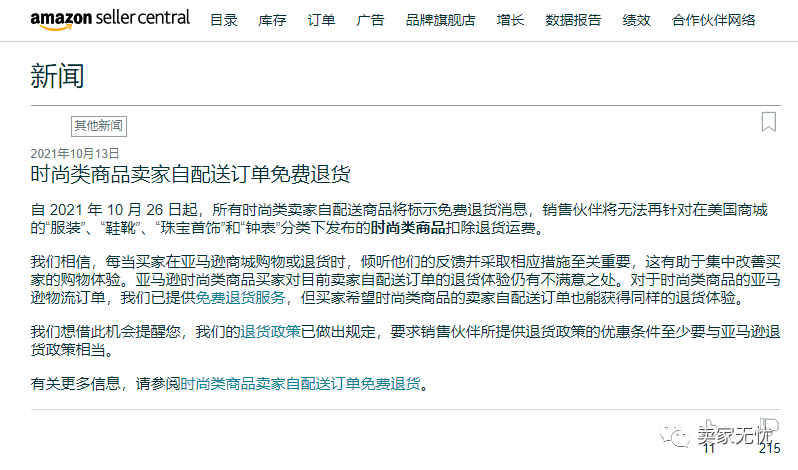 自2021年10月26日起,所有时尚类(服装,鞋靴,珠宝首饰,钟表)卖家自配送商标将强制标示免费退货消息,也就是这些类目的FBM订单在退货时候运费也需要一并退还给买家。