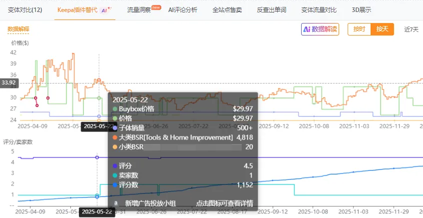 广告收预算、收出价,布局更多的流量词。B变体不参与WOOT,依旧是32.98的售价 ,广告也继续投放。