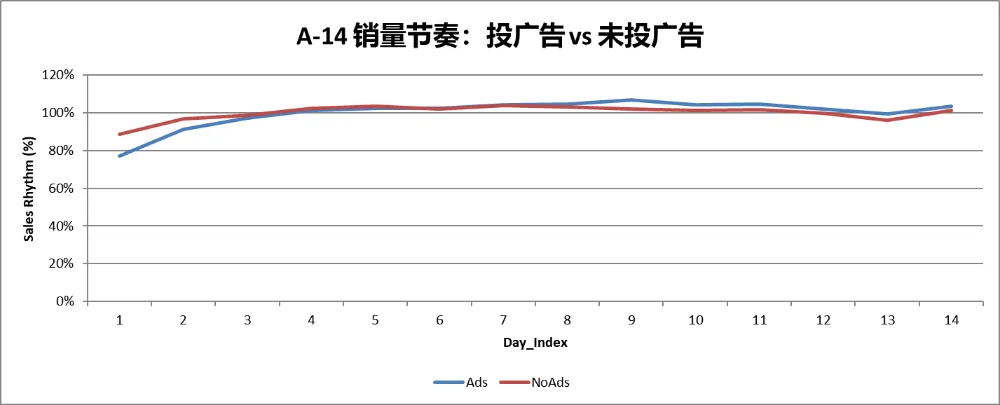 (14天BD中,投广告的BD VS 不投广告的 BD 销量节奏)
