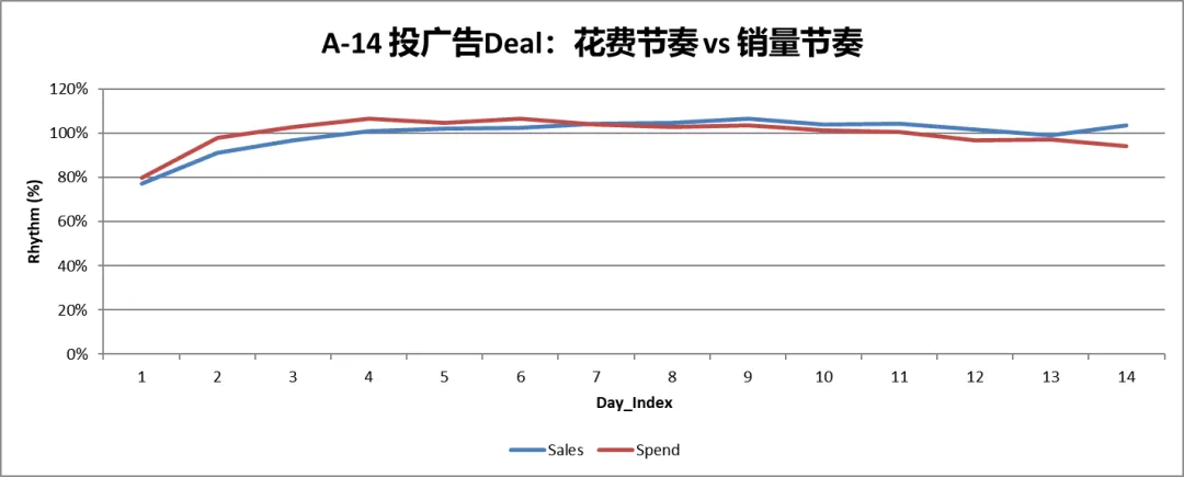 (14天BD中,广告花费节奏 VS 销量节奏)