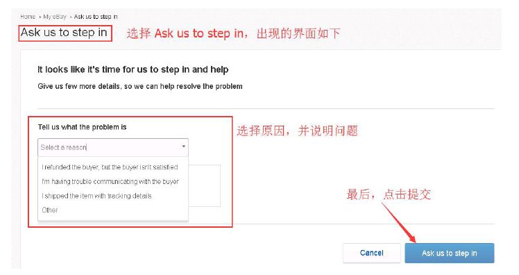 4、如果上次三种解决方式,还不能解决纠纷,就可以选择Ask us to step in and help,让客服协助解决。