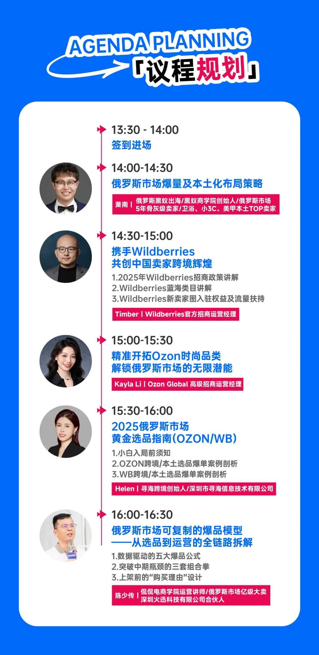 紧接着,将聚焦“爆款打造”这一核心问题展开多项议程,其中包含:从入驻到运营全攻略的Wildberries爆单秘籍、年销千万美金的俄罗斯市场实战战略拆解以及小白如何弯道超车快速选品打爆链接。