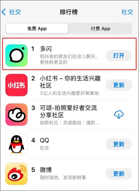 2025 年 11 月,App Store 榜单上出现了一个令人意外的名字 —— 沉寂多年、曾被无数人判定 “该放弃” 的 “多闪” 强势回归,不仅一路冲上社交应用免费榜榜首,更跻身总榜前列。