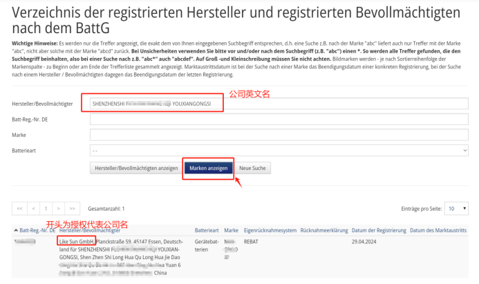 步骤二:输入公司英文名,点击Marken anzeigen进行搜索