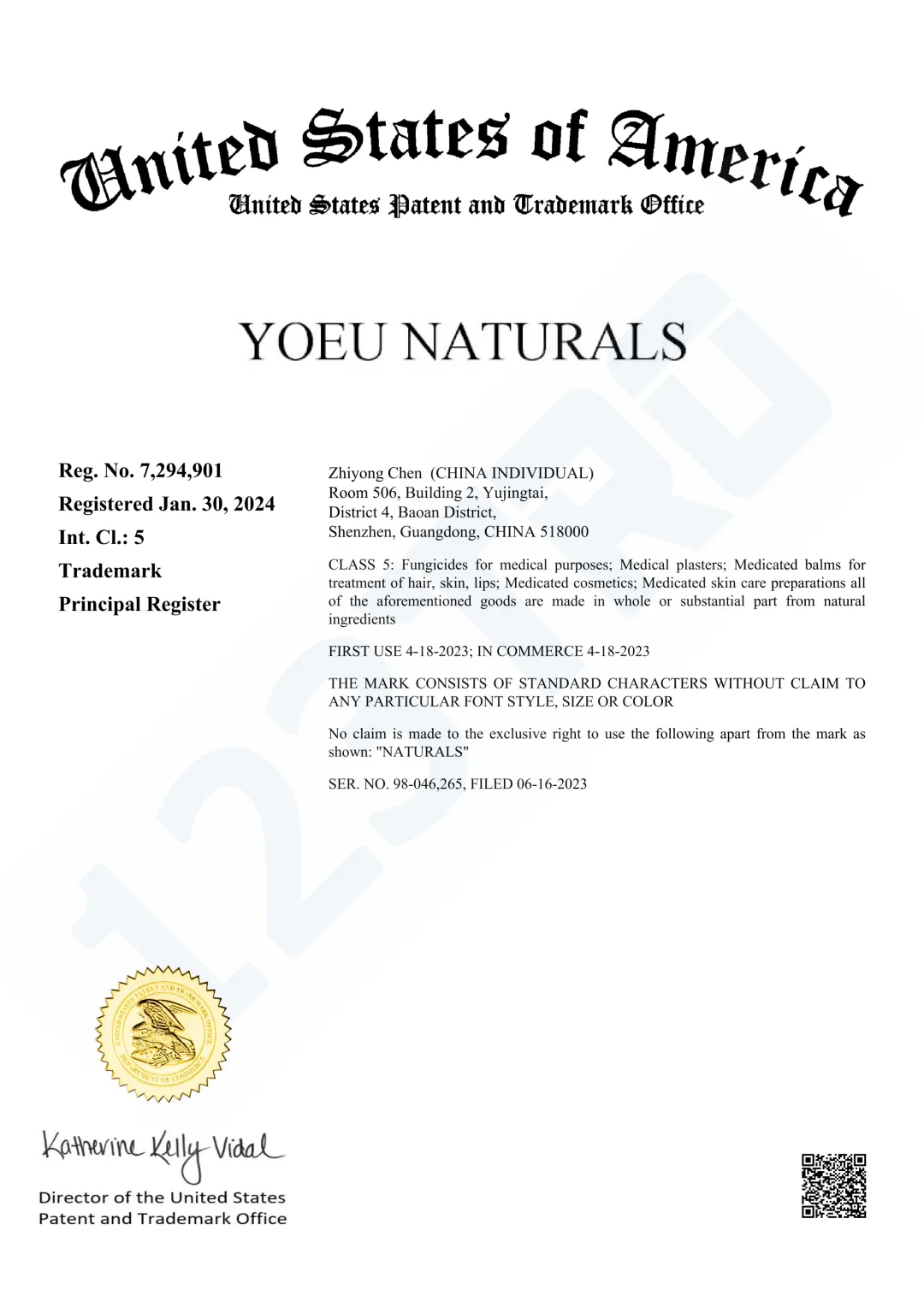 原告尚未公开具体的维权文件,小编检索后发现其名下有一条名为“YOEU NATURALS”的商标,商标产品服务范围是药用护肤膏,和起诉书中的描述一致