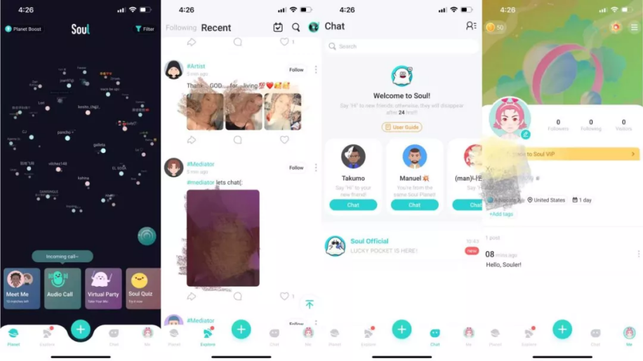 目前 Soul 海外版有星球、探索、发布、聊天和个人主页等 5 个一级菜单。
