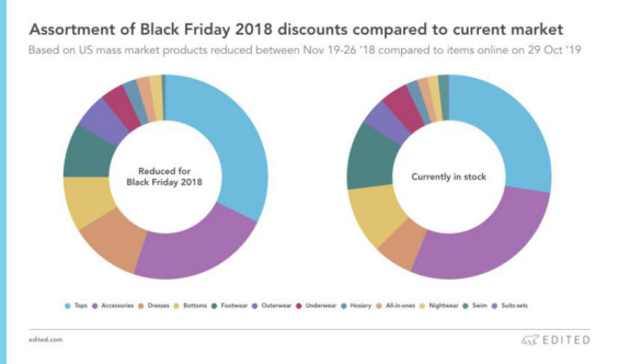 到目前为止,今年10月在美国最受欢迎的首次折扣是20-30%,例如提供28%折扣优惠的男装和女装产品。这个折扣等级与去年10月持平。然而,今年40-50%和50-60%的折扣幅度更大,占首次折扣的21%和11%(而2018年分别为17%和7%)。零售商更早、更深入地打折。
