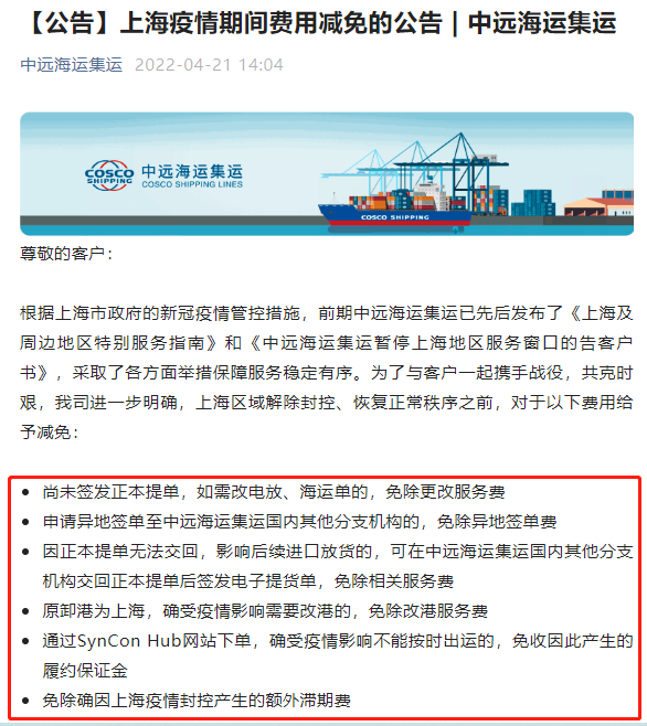 尚未签发正本提单,如需改电放、海运单的,免除更改服务费; 申请异地签单至中远海运集运国内其他分支机构的,免除异地签单费; 因正本提单无法交回,影响后续进口放货的,可在中远海运集运国内其他分支机构交回正本提单后,签发电子提货单,免除相关服务费; 原卸港为上海港,确受疫情影响需要改港的,免除改港服务费; 通过SynCon Hub网站下单,确受疫情影响不能按时出运的,免收因此产生的履约保证金; 免除确因上海疫情封控产生的额外滞期费。