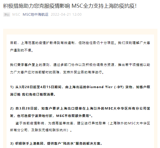 中远海、MSC公告:宣布封控期间相关多项费用减免!