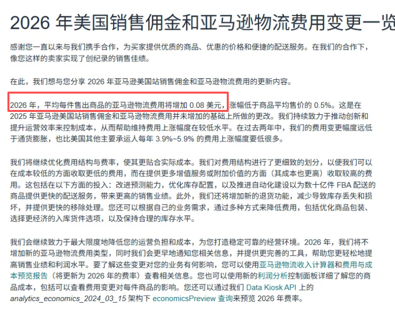 亚马逊近日发布2026年美国站卖家佣金及物流(FBA)费用调整方案,将于2026年1月15日正式生效。
